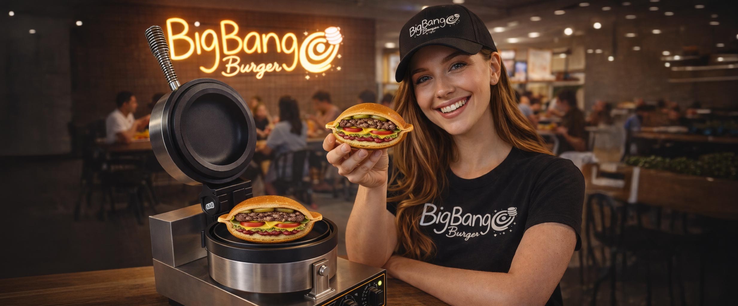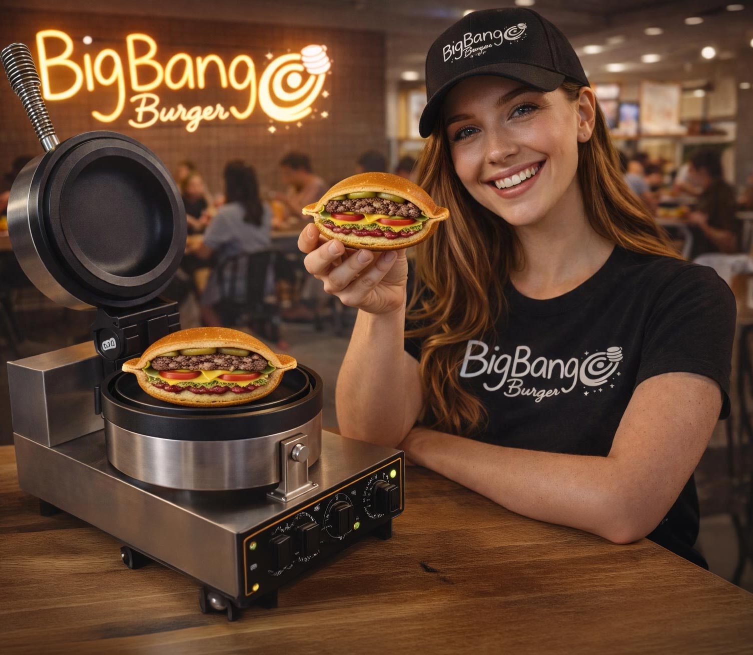 Entwickelt für moderne Gastronomiekonzepte, verbindet der Bigbangburger Show, Effizienz und Qualität in einem Produkt.
